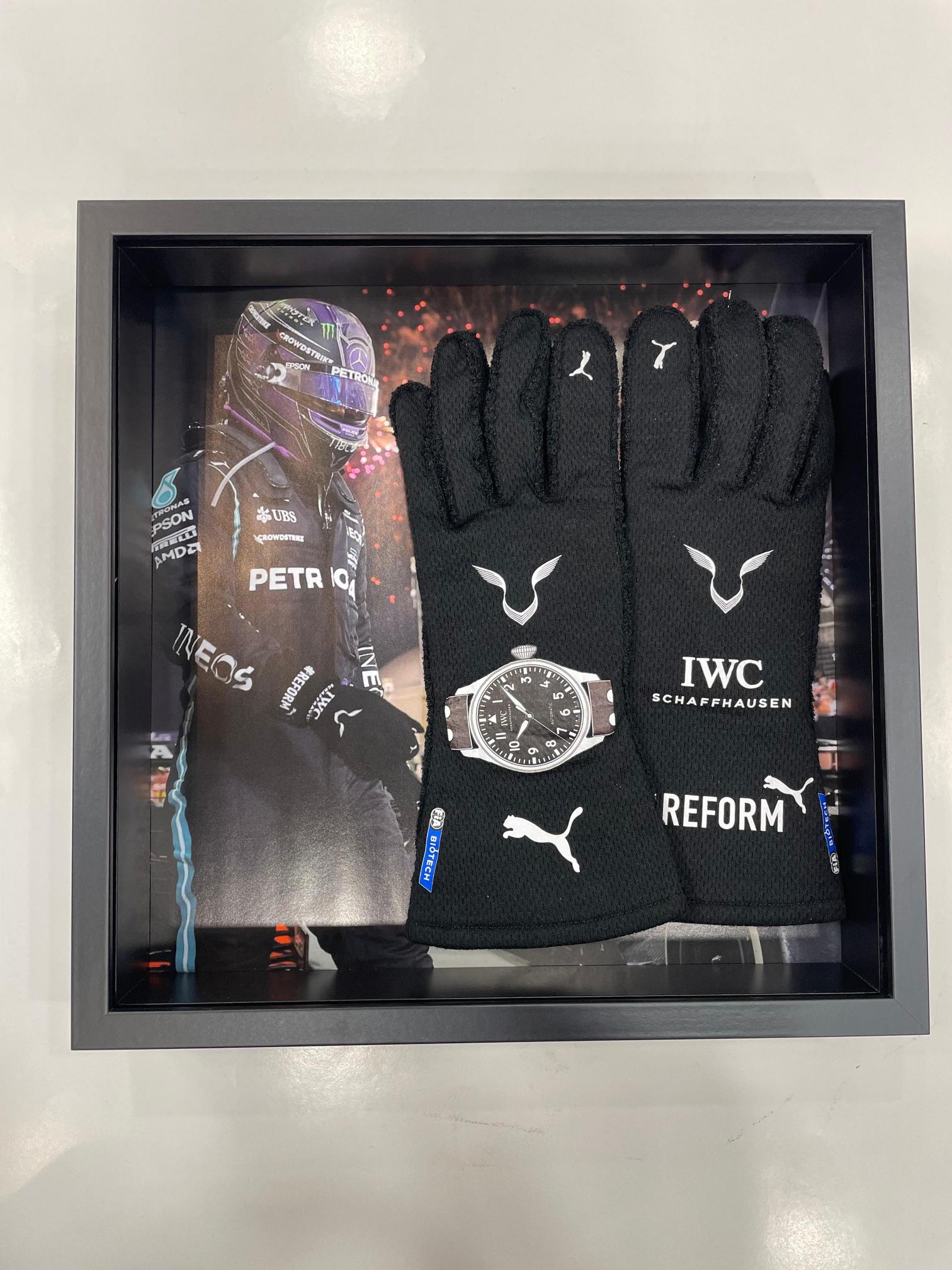 Step into the extraordinary with this remarkable piece of Formula 1 history — a pair of race-used gloves worn by seven-time World Champion Lewis Hamilton during his 2021 season with the Mercedes-AMG Petronas Formula One Team. These gloves are an authentic artifact from a historic season, capturing the essence of Hamilton's incredible skill, determination, and passion for racing. Each glove is adorned with iconic sponsor logos, including IWC Schaffhausen and Puma, and carefully displayed in a premium showcase frame alongside a dynamic image of Lewis Hamilton in action.