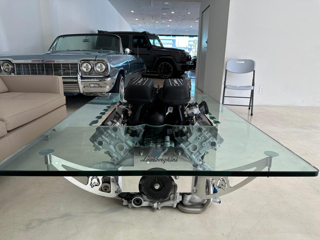 The table's design successfully marries automotive innovation with modern furniture aesthetics, making it a stunning statement piece for any space. Whether placed in a living room, office, or showroom, this coffee table exudes an undeniable air of sophistication and exclusivity. Constructed with precision and a passion for performance art, it is not only a conversation starter but also a tribute to the craftsmanship and power of Lamborghini engineering. Perfect for car enthusiasts and design aficionados alike, Tom Bates has created a functional piece of art that celebrates speed, style, and ingenuity.