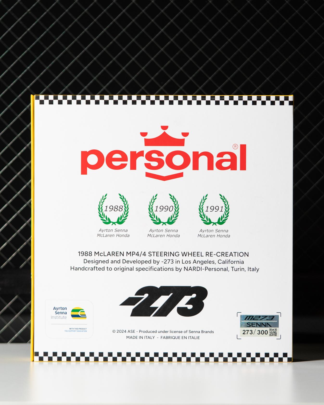 This limited-edition steering wheel pays homage to Ayrton Senna da Silva—one of the greatest Formula 1 drivers of all time—and the legendary 1988 McLaren MP4/4, the most dominant car in F1 history. Designed and developed by -273 in Los Angeles, in collaboration with the Senna family, Senna Brand, and renowned Italian manufacturer Nardi-Personal S.p.A., this wheel is a faithful recreation of the one Senna used during his historic championship season.
