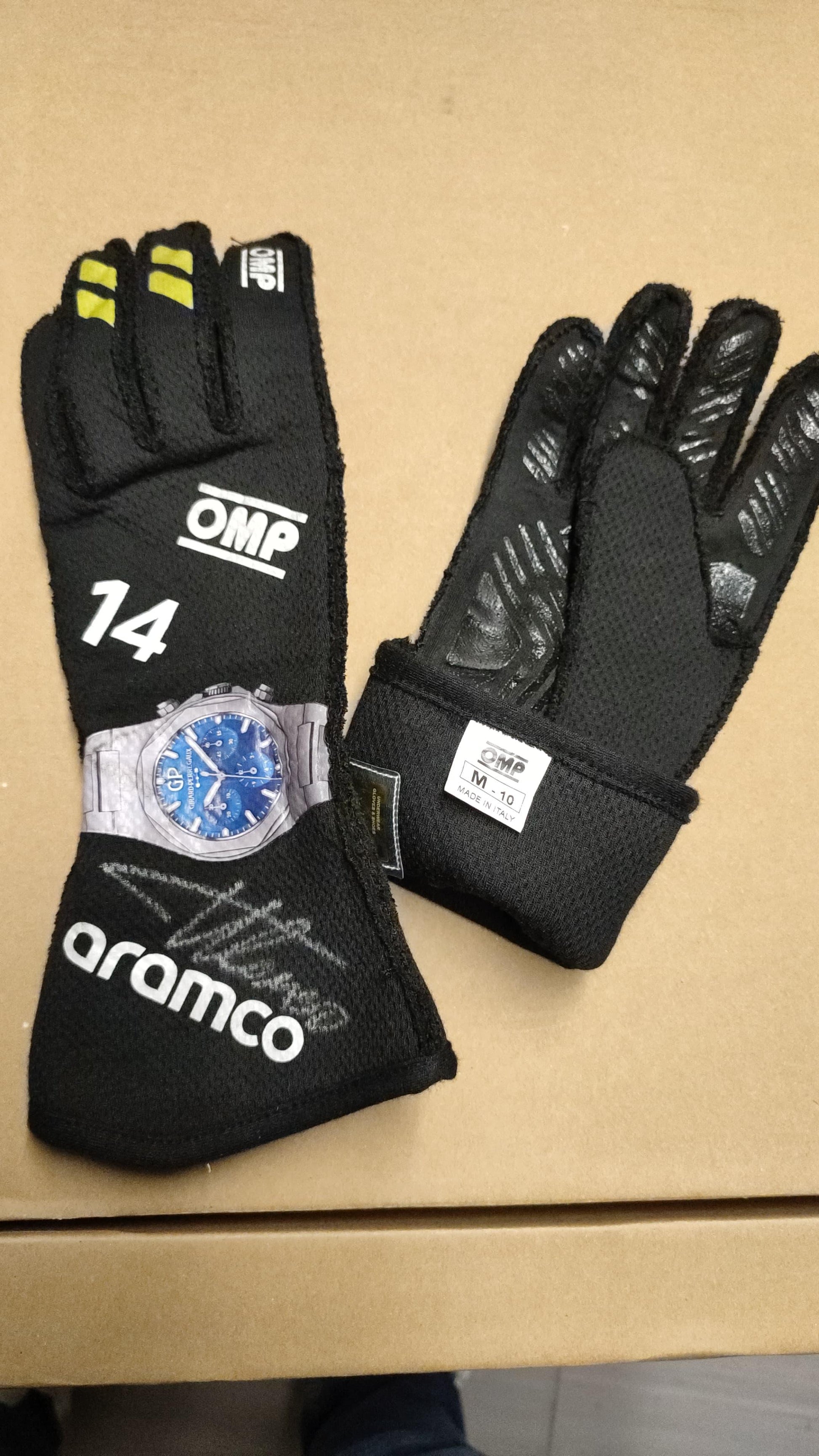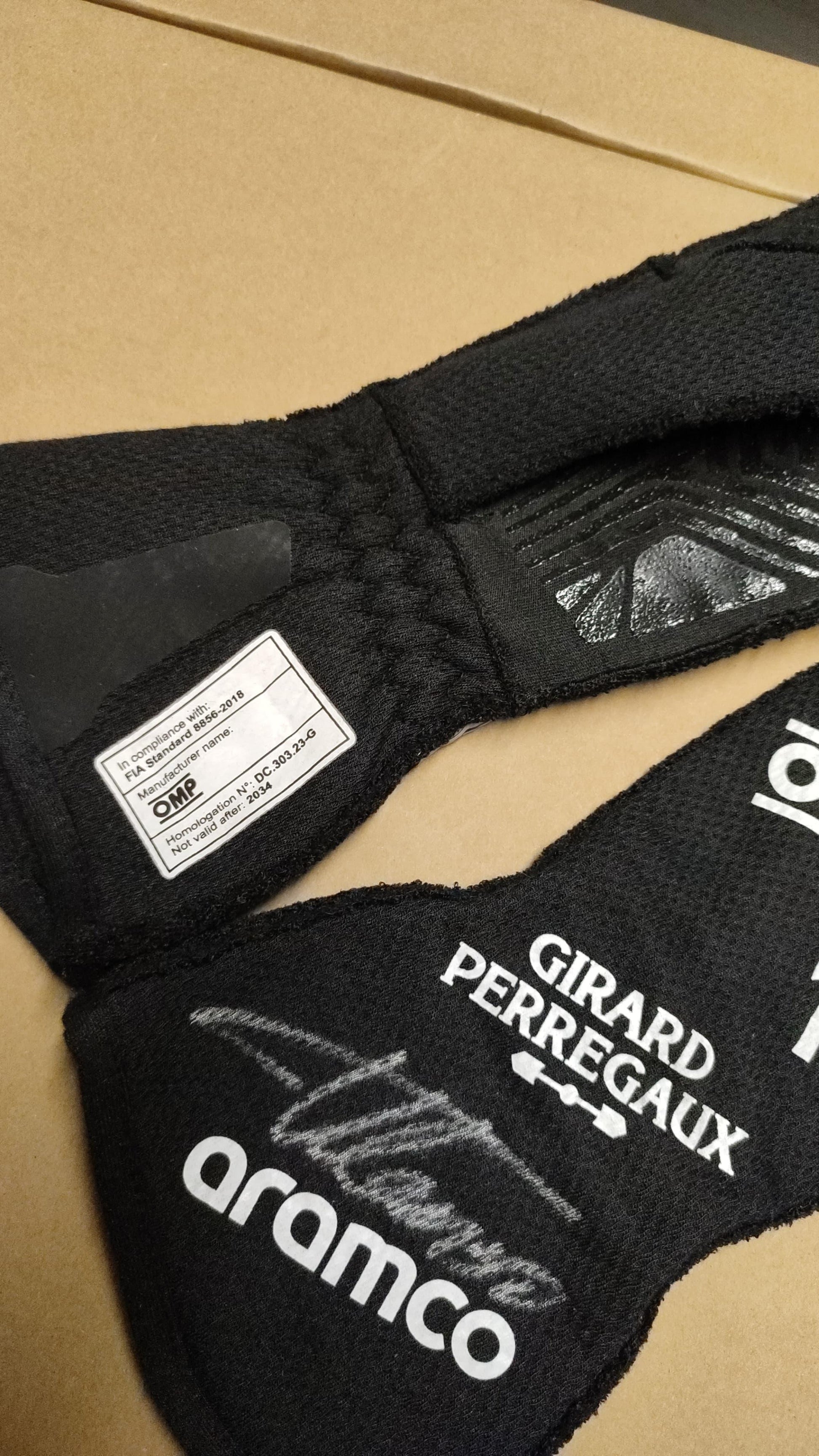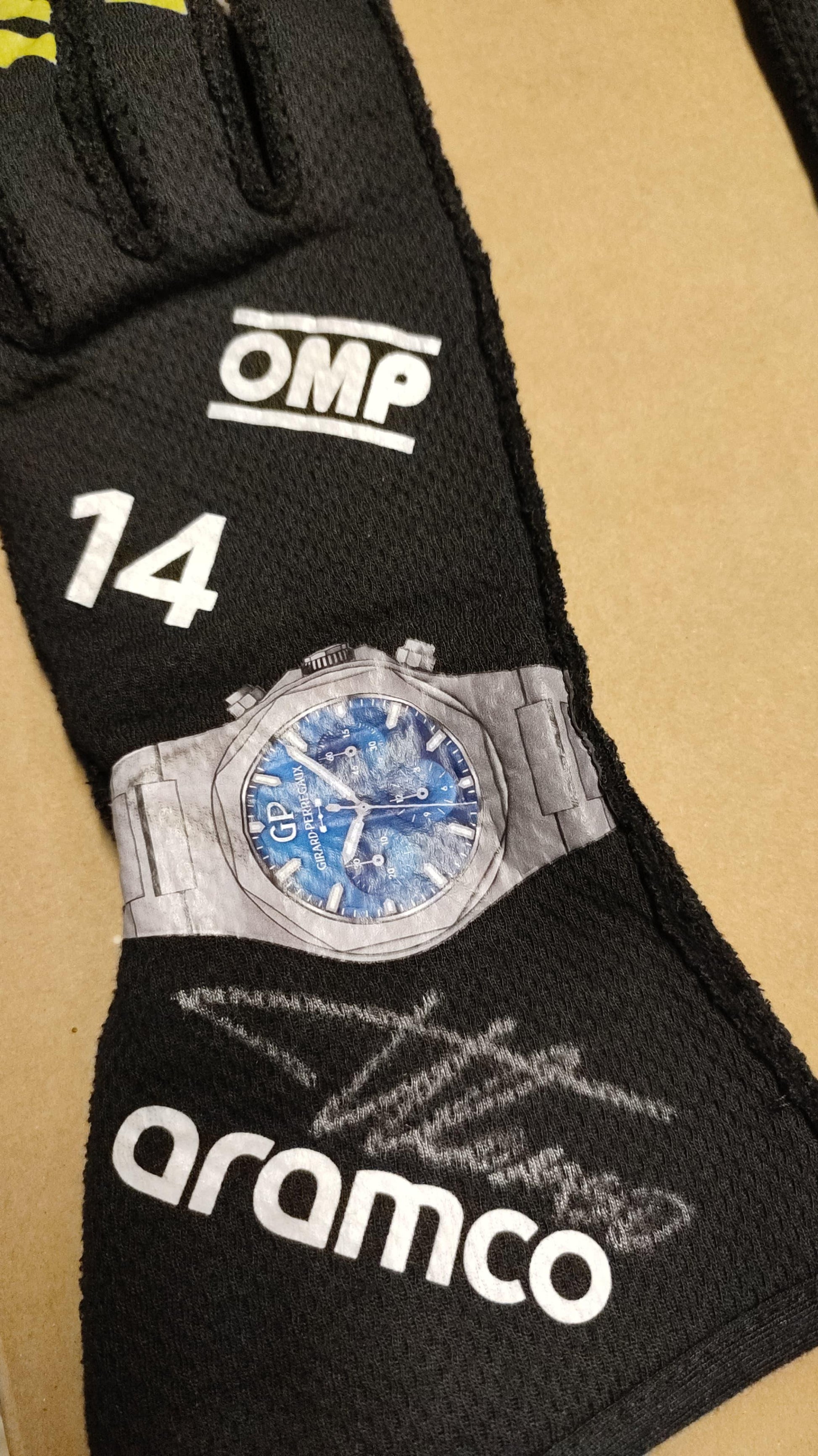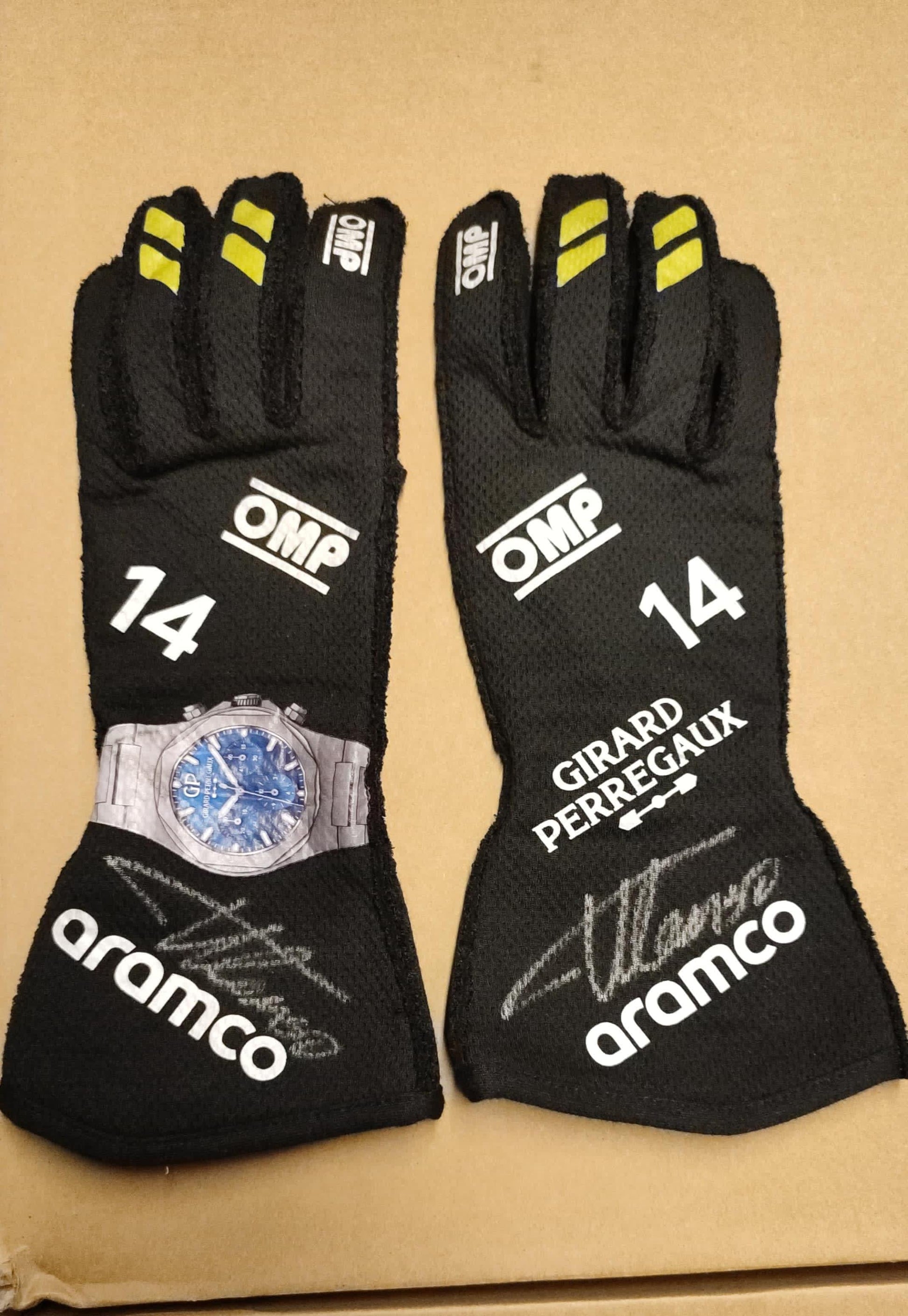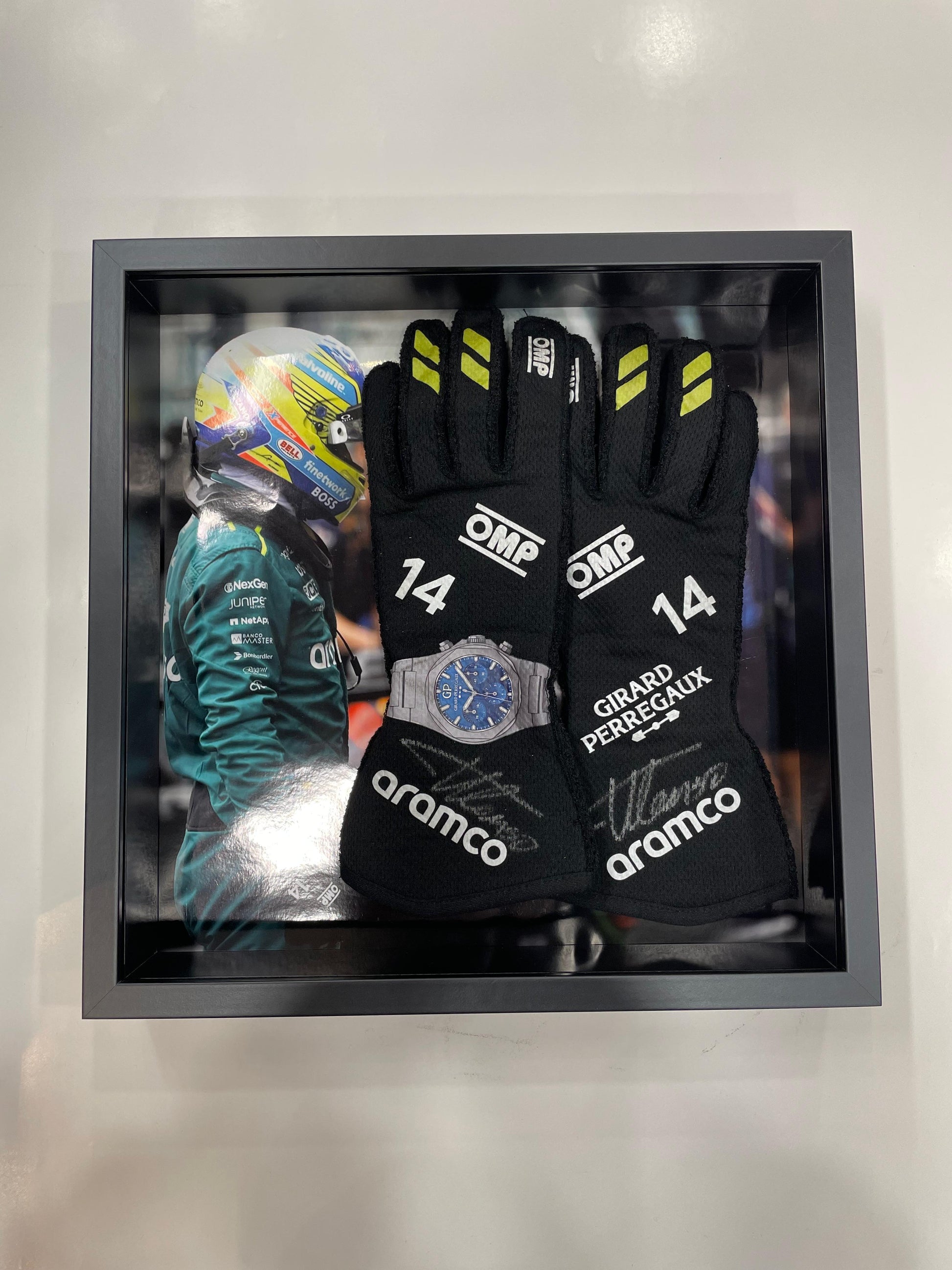 Own a piece of motorsport history with these exclusive race-used gloves, personally signed by legendary Formula 1 driver Fernando Alonso. As part of his 2024 Aston Martin Formula 1 season, these gloves have been worn on the circuit by the two-time World Champion himself. Designed with the highest quality and cutting-edge technology by OMP, the gloves are tailored for performance, showcasing exceptional durability and comfort. With iconic branding from Aramco and Girard-Perregaux, this rare collector’s item captures the essence of Alonso’s spectacular racing legacy.