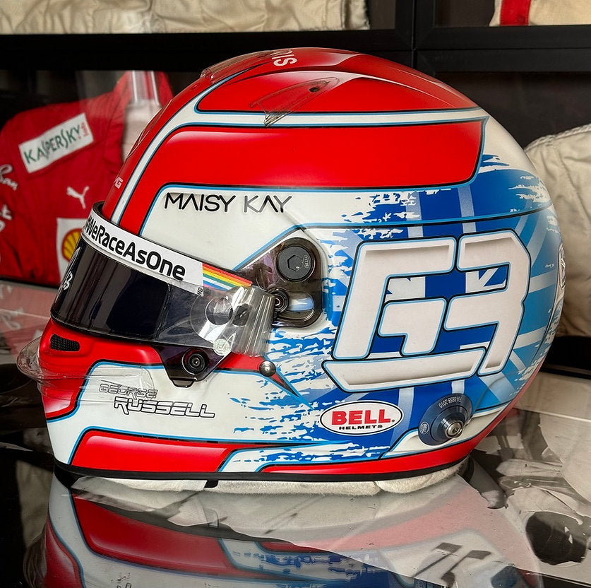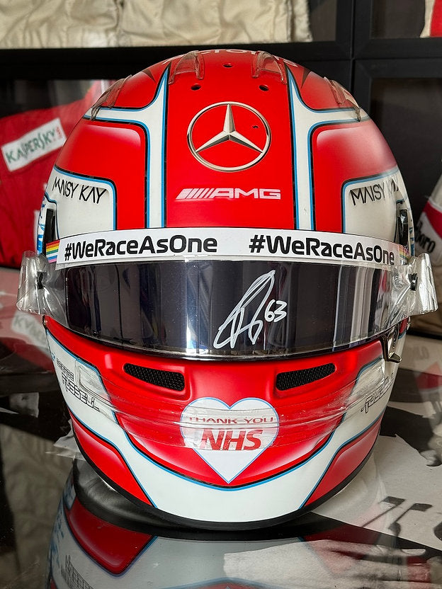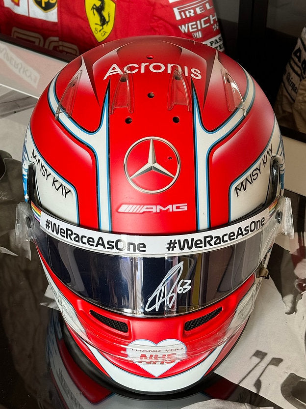Personally signed by George Russell on the visor, this extraordinary piece showcases the passion and precision of Formula 1 racing. A must-have for collectors and fans alike, this exclusive item is a stunning addition to any racing memorabilia collection.
