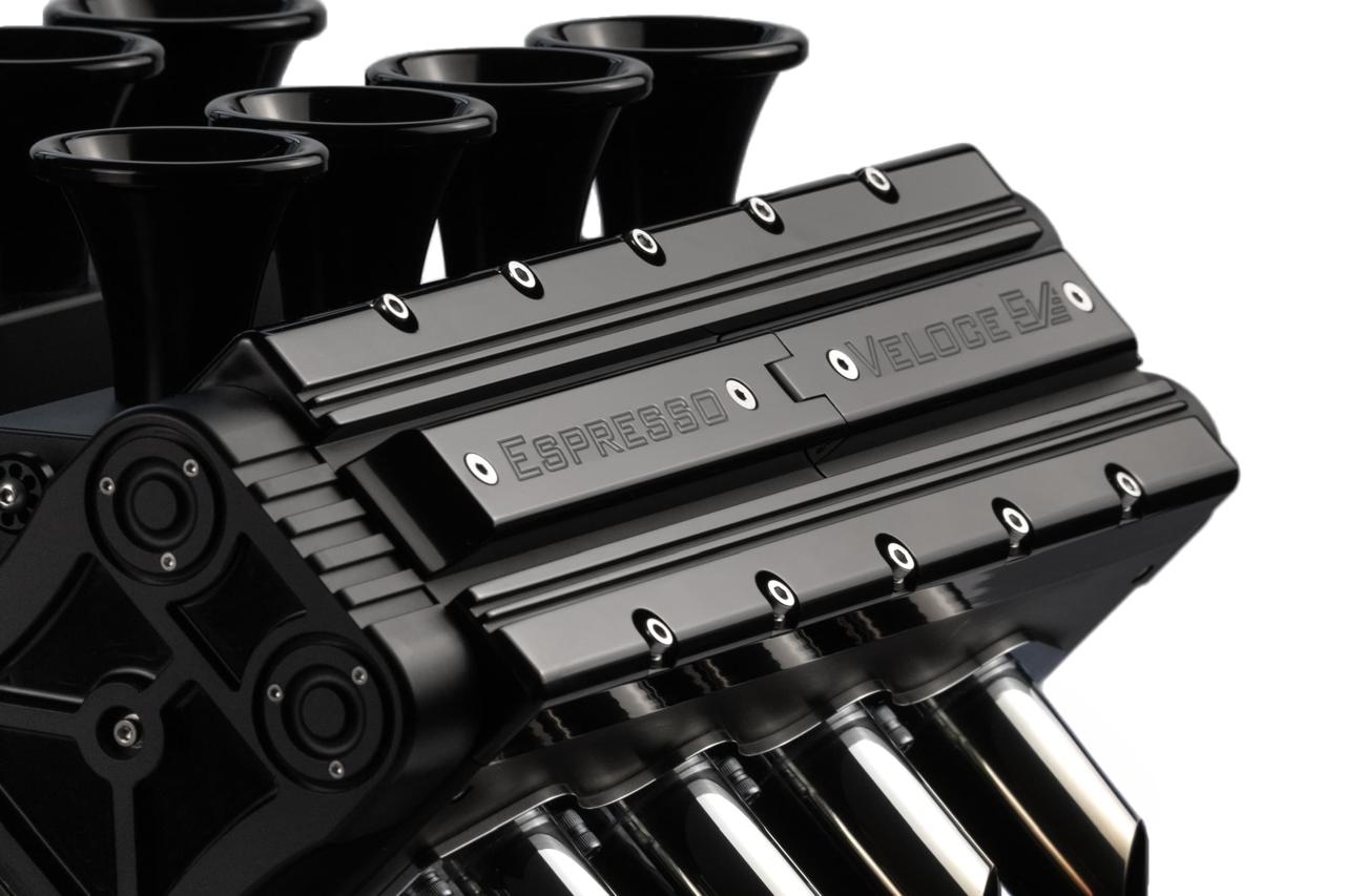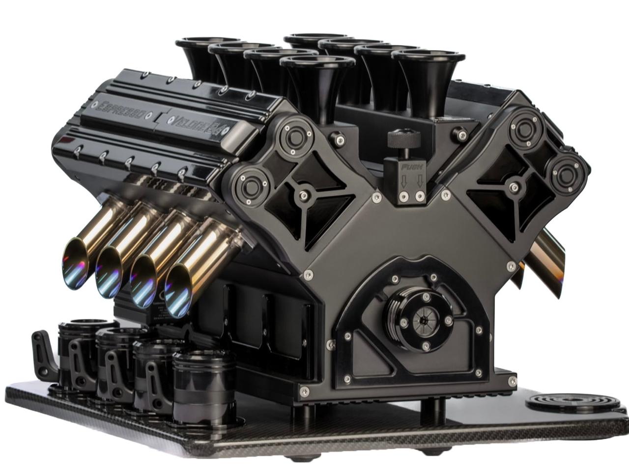 - Design Features: Quad exhaust-style steam outlets, V8 block layout, CNC-machined piston cup holders